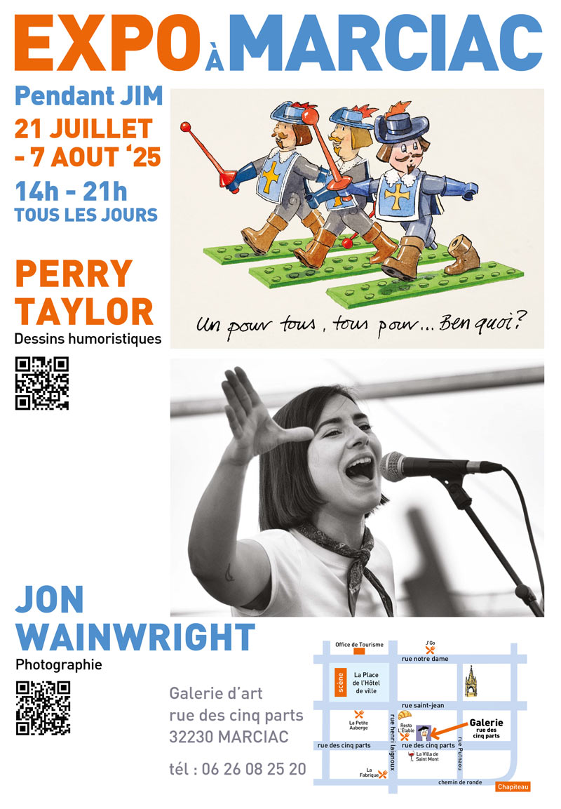 Marciac (32). During world famous Jazz festival in Marciac this year, Perry shares his pop-up gallery with Yannick Beslot, Galerie d'Art Rue des Cinq Parts, Marciac.